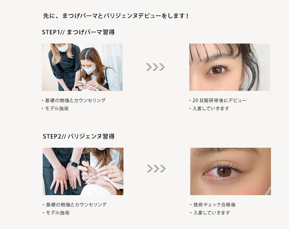 独自のカリキュラムを構築しているので、未経験からでも”20日間研修後”にまつげパーマデビューが可能です。